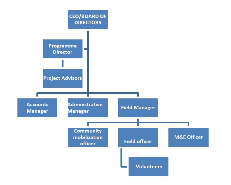All project advisors, as well as deputizing for the CEO specifically oversee the design of strategic plans, projects, conduct baseline survey/feasibility studies, and undertake monitoring and Evaluation of ongoing or completed projects. The field manager is in charge of all field projects, i.e. counseling and testing outreach programmes, malaria prevention, TB awareness, water sanitation and hygiene, poverty reduction, and gender advocacy. He is also in charge of preparation and submission of project reports and proposals. He is assisted by the community mobilization officer, field officers, CEO/BOARD OF DIRECTORS Accounts Manager Administrative Manager Field Manager Community mobilization officer Field officer Volunteers M&E Officer Programme Director Project Advisors